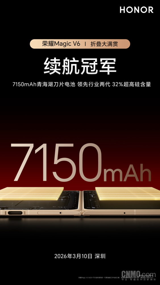 该款电池由荣耀与ATL联合研发,采用第五代硅碳负极材料,硅含量提升至32%,是行业均值的两倍;能量密度突破985Wh/L,远超车规级动力电池标准。这一关键性技术突破,让荣耀Magic V6得以在8.75mm的极致轻薄机身中,嵌入7150mAh超大容量电池,成功刷新折叠屏手机的续航纪录。