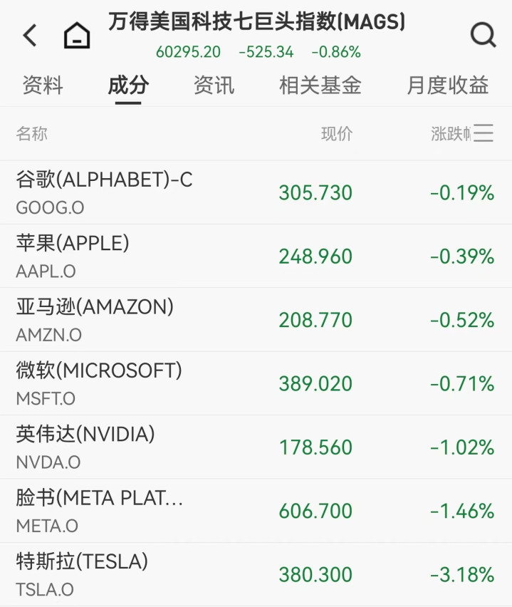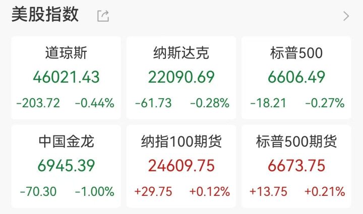 大型科技股集体走弱,万得美国科技七巨头指数下跌0.86%。特斯拉跌幅超过3%,Meta和英伟达均跌逾1%,微软、亚马逊、苹果等小幅下行。能源股则逆势上涨,埃克森美孚、雪佛龙等收高,斯伦贝谢大涨超5%。中概股多数下跌,纳斯达克中国金龙指数跌1%,阿里巴巴下挫7.09%,阿特斯太阳能暴跌近27%。